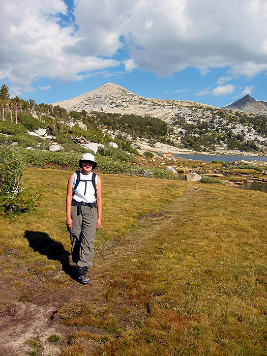 Kim on descent from Peak 11500'. Peak in background. Note prominent black pyramid, which is the toughest obstacle along the north ridge of Parsons Peak.