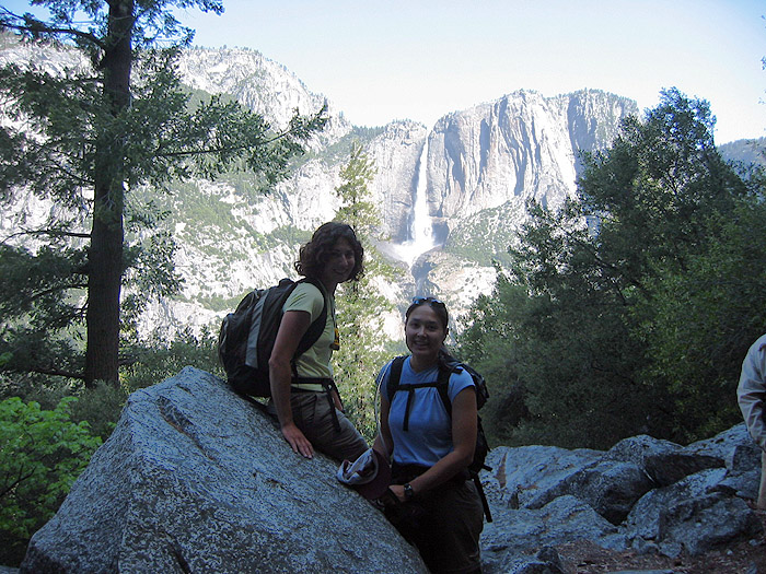 Rachel & Kim stop in front of Yosemite Falls on the way up to Glacier Point and, ultimately, Sentinel Dome.