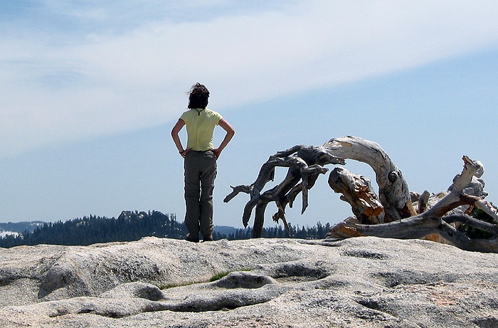 | Rachel contemplating the view from Sentinel Dome. We took the trail from Glacier point to Sentinel Dome. There was very little snow on the trail, except near the summit of the dome. The incline was shallow and the snow was consolidated so it was easy to walk on. Did our last bit of skiing for the summer on the way down! |
