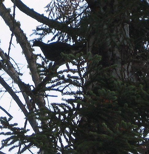 | The sounds of the forest included someone blowing over the opening of a coke bottle. This someone turned out to be a blue grouse. We saw him doing his mating dance in a clearing near Sentinel Dome but he retreated to the trees when we tried to photograph him. Wily Grouse! We wished him luck in his efforts to find a mate. |