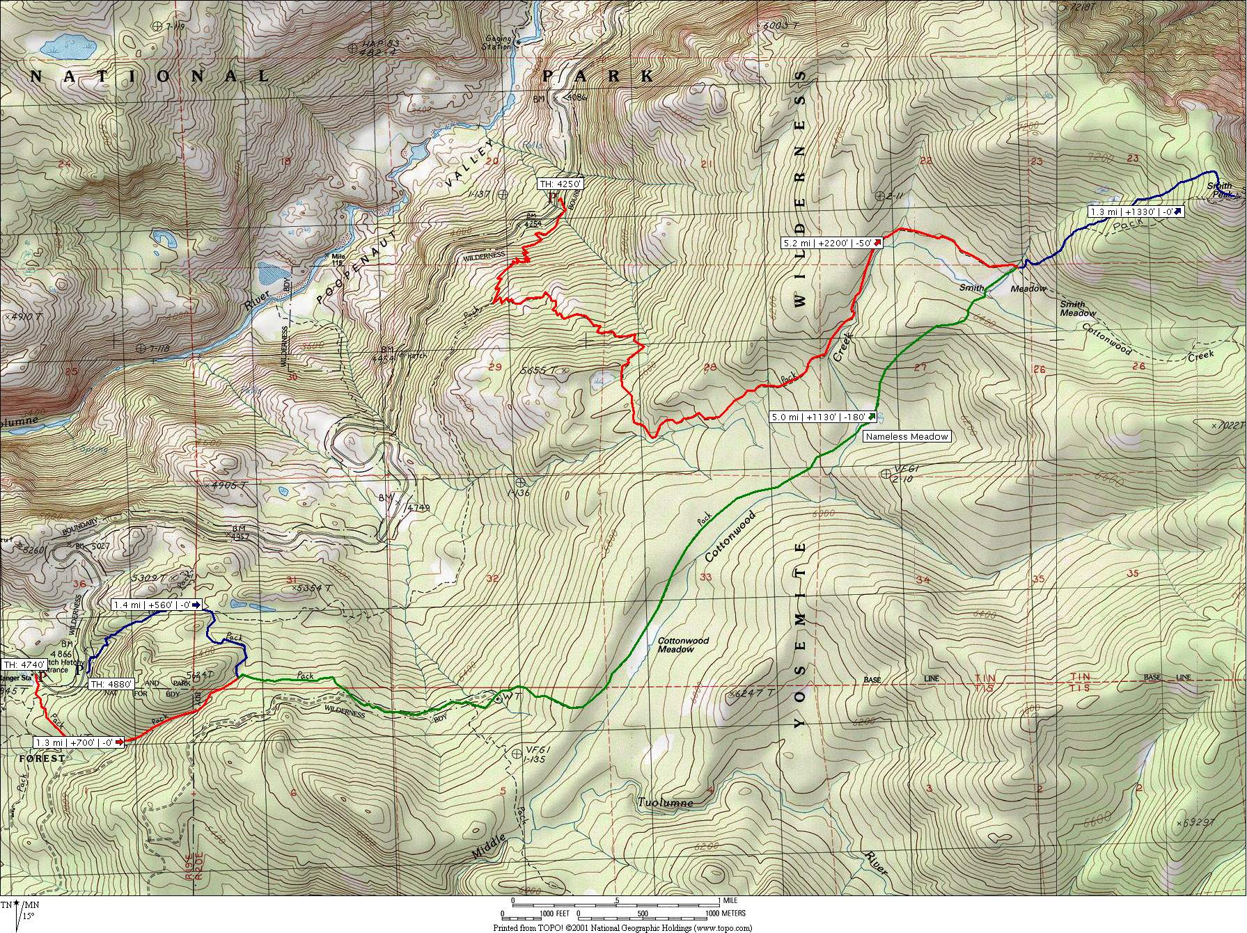 Our route from Mather Ranger Station to the summit of Smith Peak. Some other alternate routes are drawn.