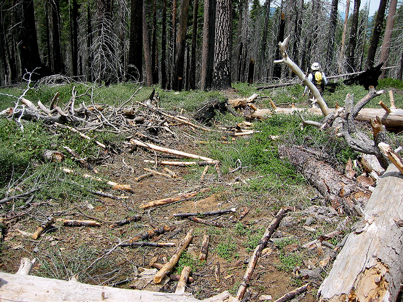 Typical log-covered trail below Cottonwood Meadows.