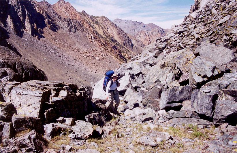 Kim cresting Virginia Pass. Geologically and visually, Glimes Canyon resembles Bloody Canyon, 25 miles to the south.