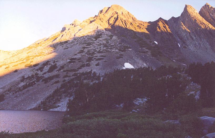 | Virginia Peak at sunrise from our campsite on the eastern shore of Return Lake. Notice the dark red intrusion in the center of the peak? I'm not certain (geologist please set me straight: e-mail), but I believe the red portion is a "roof pendant", or small rafts of resistant meta-sedimentary rocks which once floated on top of the molten Sierra Nevada batholith. |