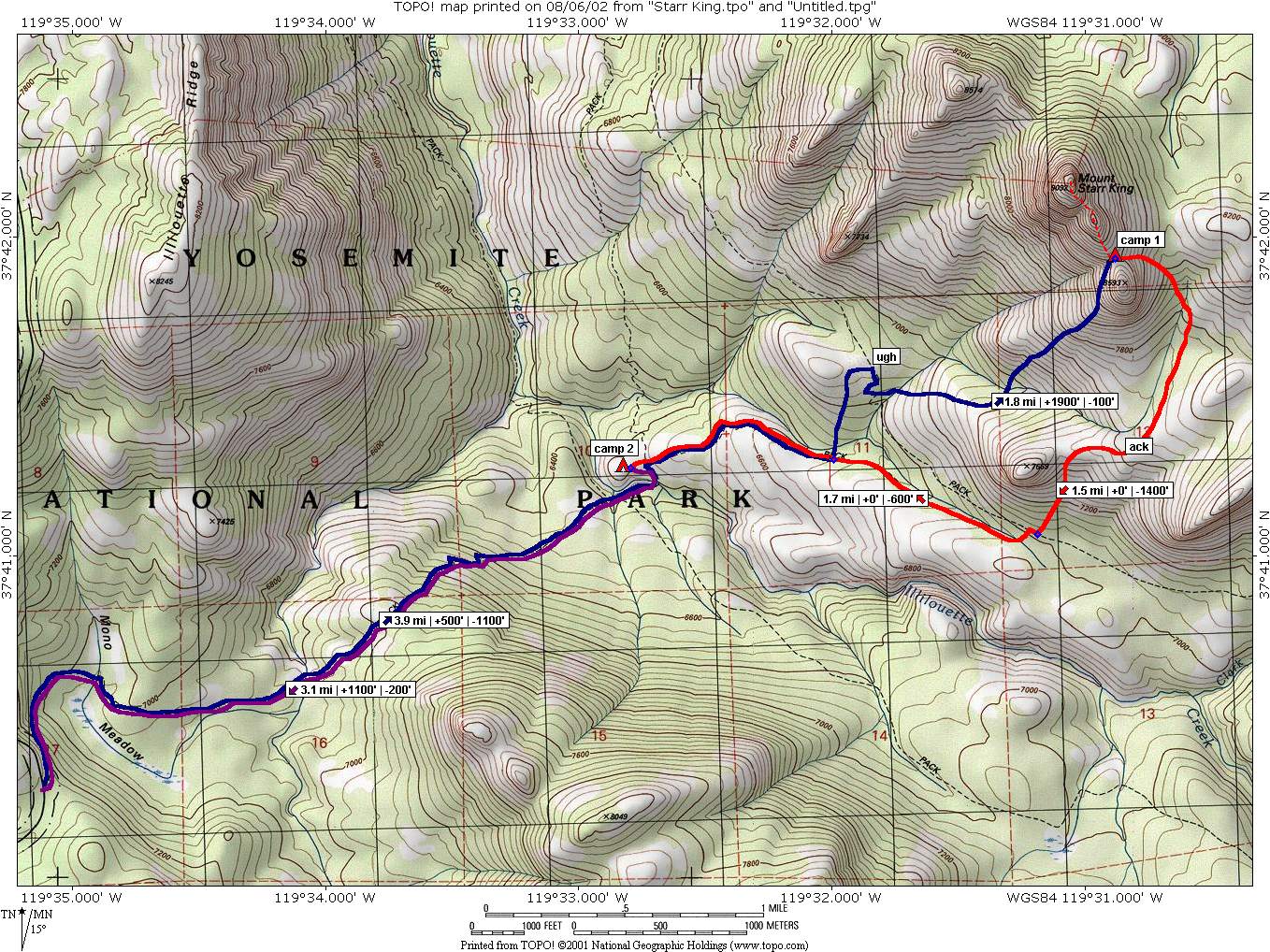 | Topo map describing our climb of Mount Starr King in August, 2002. Pick your approach route carefully; we opted for the steep granite slopes of the southern summit's southwest side. Most people ascend the gully between the south and middle summits. Great camping can be had between the south and middle summits. Unless you like bushwhacking through manzanita hell and burned-out forests, descend the way you came. We enjoyed our second campsite (and the much-needed water) on the shore of Illiloutte Creek. |