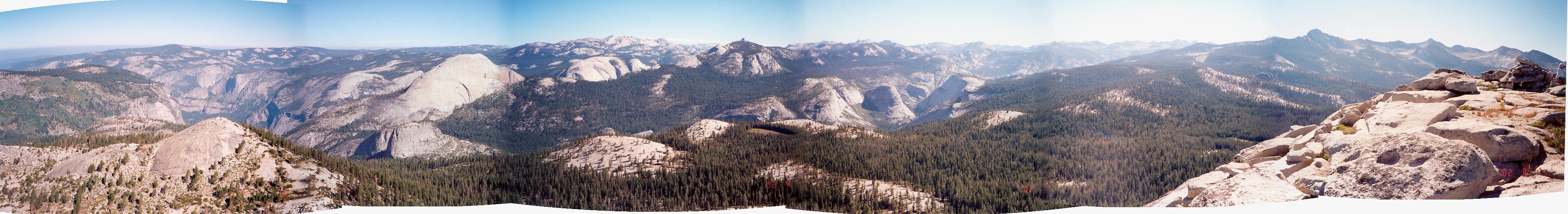 Panorama from Mount Starr King's summit. Views of Glacier Point, Yosemite Valley, Half Dome, the Clark Range, and many other High Sierra peaks.