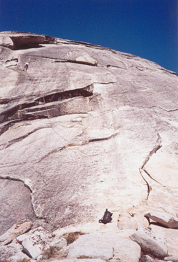 | Kim rappelling from the south slopes route. She'll rappel off the rope here, but one can easily downclimb (class 3/4) from there. The rappels are kind of an issue on this peak. Without two ropes, you'll probably run into trouble. Two 8mmx50m ropes would suffice for this peak. |