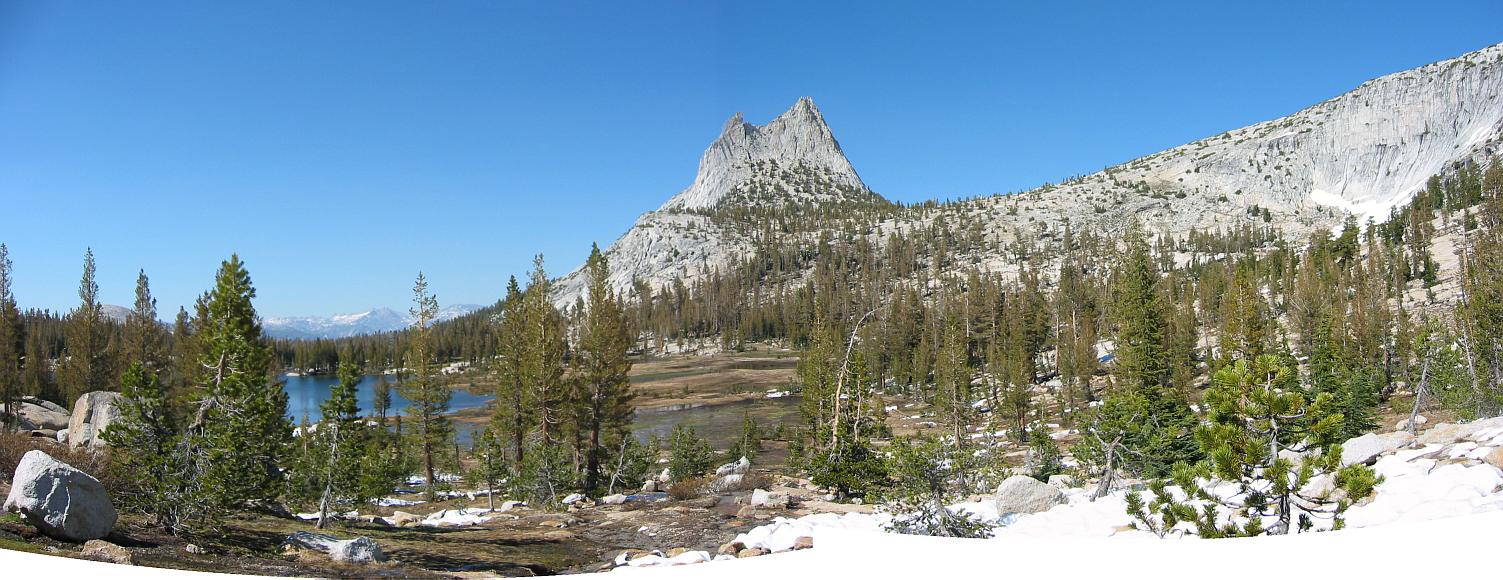 Panoramic view of Cathedral Peak and Upper Cathedral Lake.
