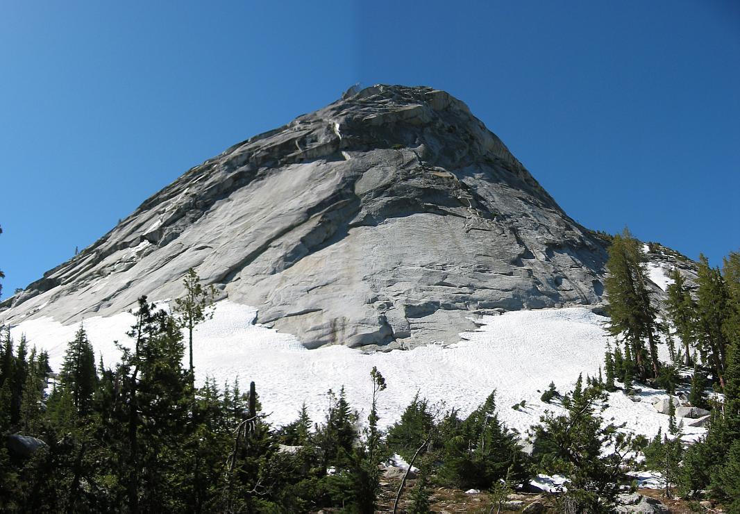 North Buttress of Cathedral Peak and steep snow from the JMT.