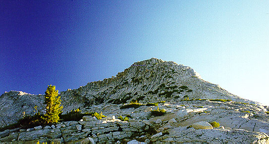 Setting sun backlights the high granite ridge west of Vogelsang Peak.