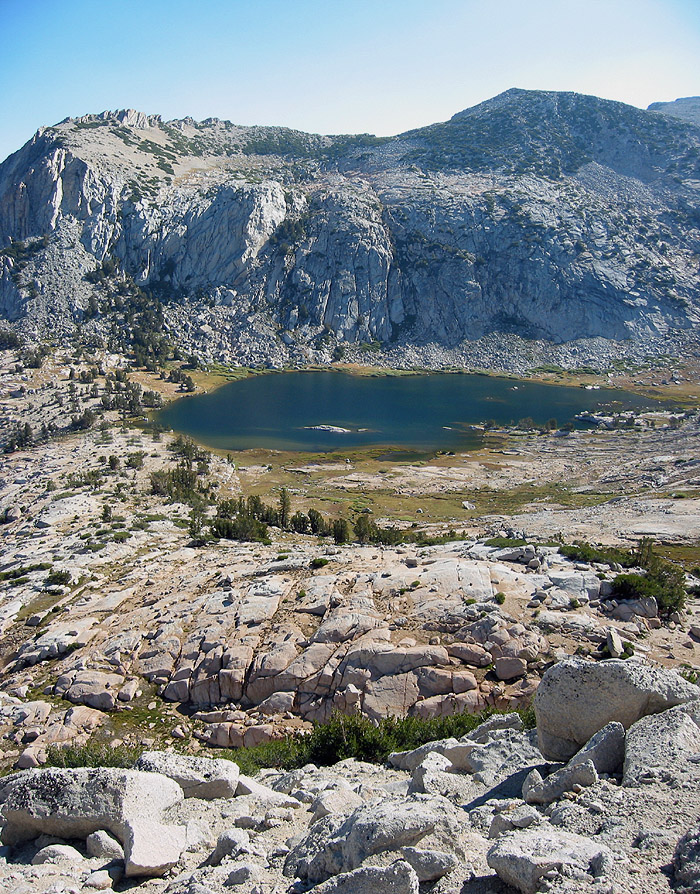 Panoramic view of Fletcher Peak and Vogelsang Lake from lower section of Vogelsang Peak's Northeast Buttress route.