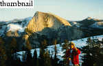 In November, 1998, I took an overnight trip with Antoine Guitton and Olivier Meynier around what I dub the "North Dome Loop". In the winter, Tioga Road is closed, and along with it the easiest access point to North Dome, the Porcupine Flat Trailhead. However, this fact greatly whittles down the crowds. We hiked up the Yosemite Falls trail, traversed the valley rim, and camped on the dome just west of North Dome. The views of Half Dome are unforgettable! The next day, on the heels of a strong winter storm, we hiked down the Snow Creek Trail on a long 14-mile day, arriving back to the Valley just as the rain (snow higher) started in earnest.