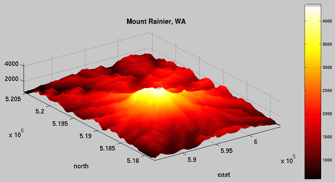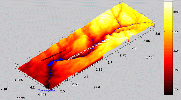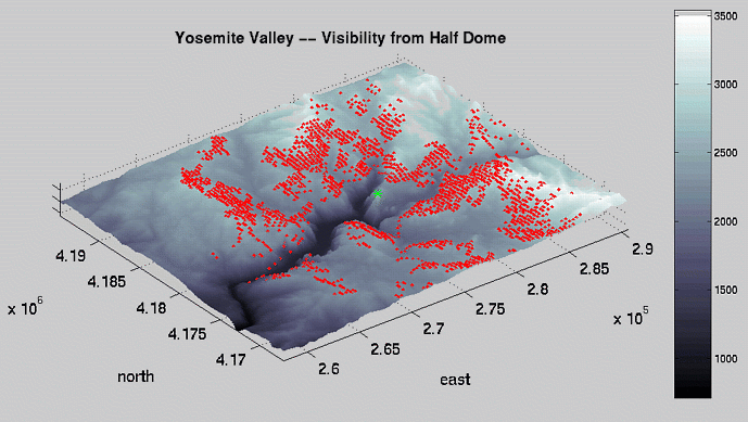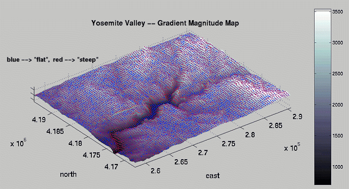 I use a Linux workstation, so my options, short of writing my own conversion software with SDTS++, are more limited. Click here and I'll take you through my data processing flow. After I get the data into a processible state, any 2-D image processing techniques are fair game. As you can see below, I've made "steepness maps" by a simple gradient magnitude computation. I've also tried to solve the "traveling hiker problem" ( explanation | examples ): given a series of fixed points, determine the optimal path passing through all the fixed points, i.e., the path that minimizes the amount of work done by the hiker. My approach is crude, so please poke fun at me if I deserve it, or better yet, give me your solution!
