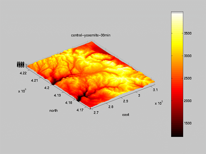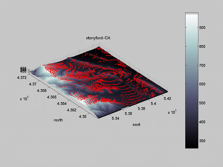 To warp the data, I have written a small MATLAB script, affineTransf.m, which prompts the user to pick four control points (corners of original map), then warps the map via a simple Affine transformation to the corners of the map, where the coefficients of the transformation are gotten from the user picks. Mathematically, the process is defined as follows: