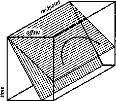 Figure 17 Inside the data volume of a reflection seismic traverse are planes called radial-trace sections. A point scatterer inside the earth puts a hyperbola on a radial-trace section. | ![]() |