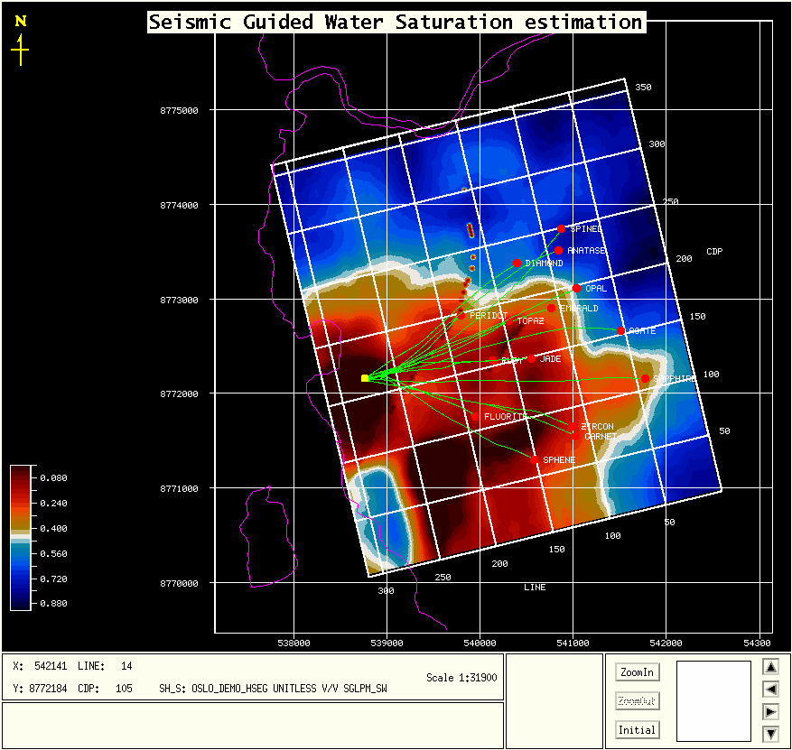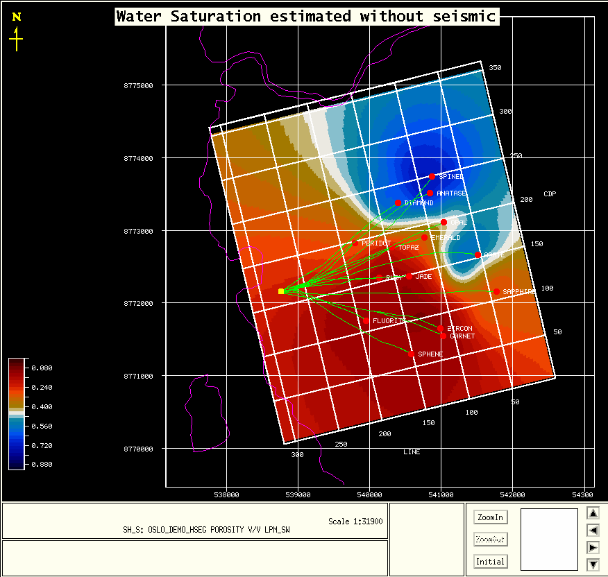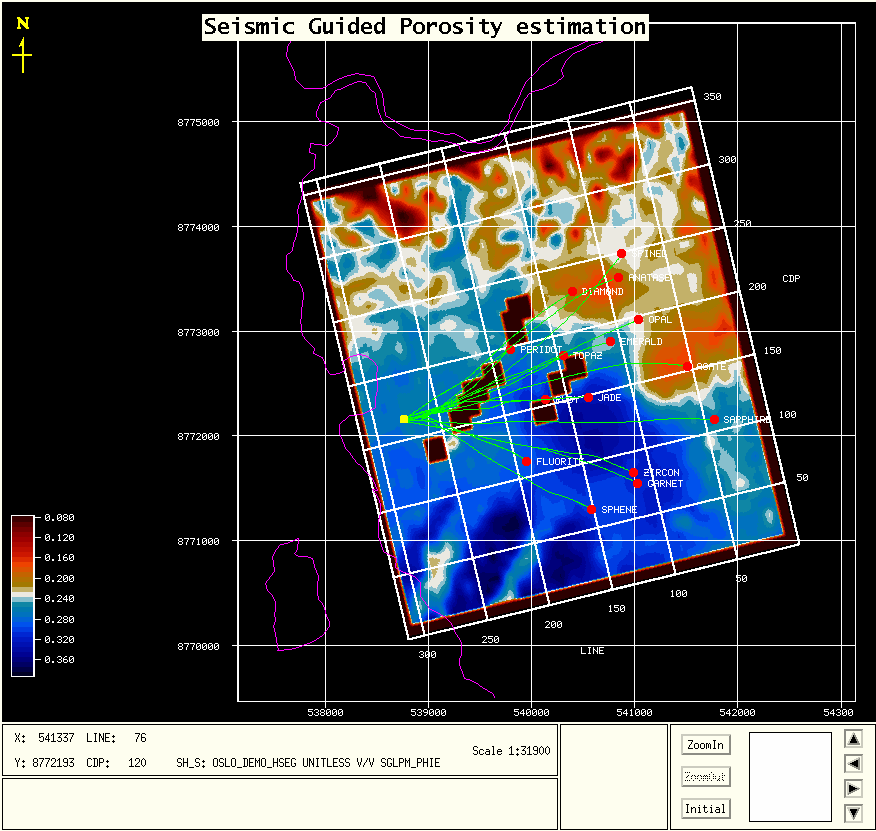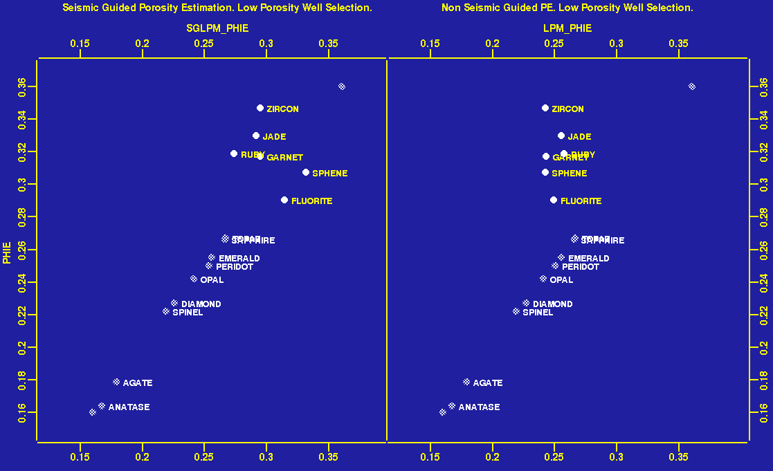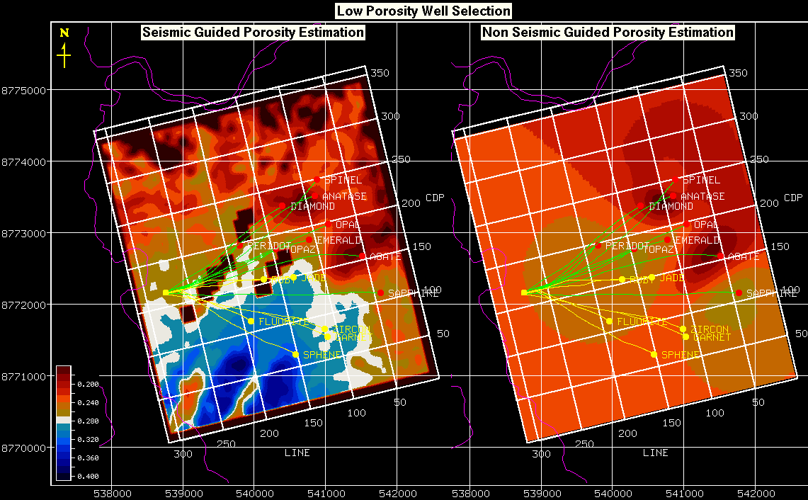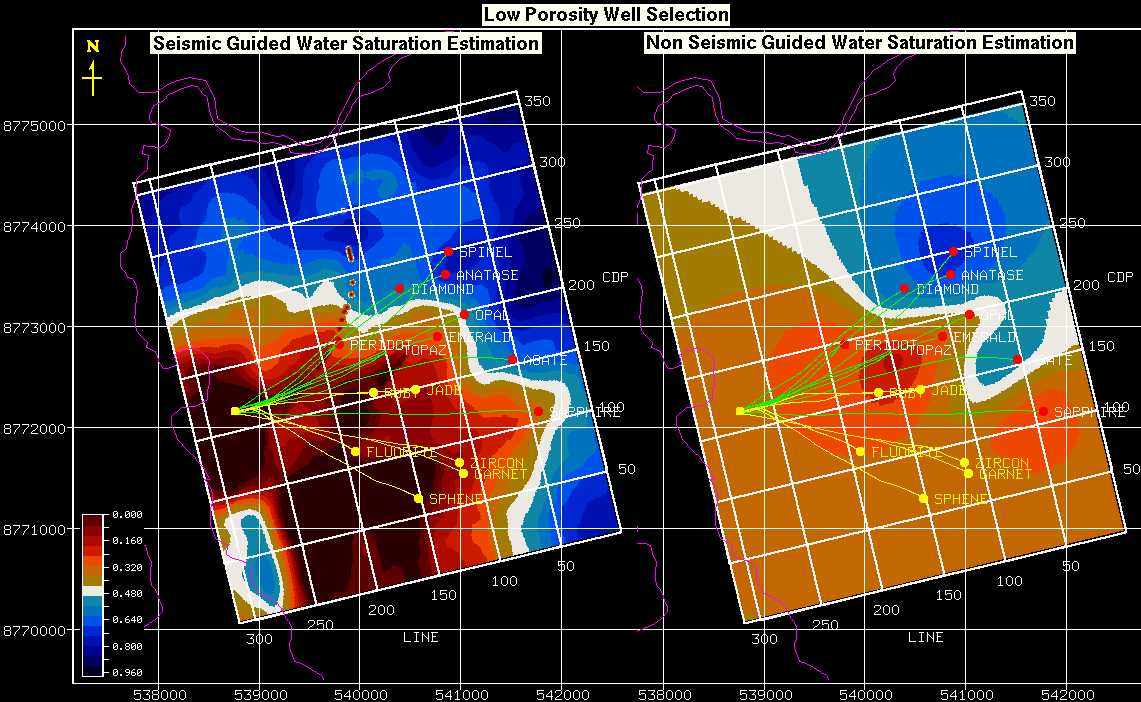 It is reassuring that both methods have good agreement, because while the borehole data are more reliable, it measures only a very small volume of the reservoir; the immediate vicinity of the wells. Only seismic data contains information on the volume away from the logged boreholes.