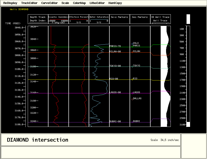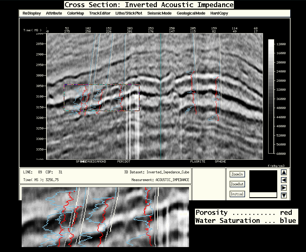 note the similarity between the impedance log to both the porosity log and the impedance well trace (right track). This is significant as the acoustic impedance well trace was generated WITHOUT well data.